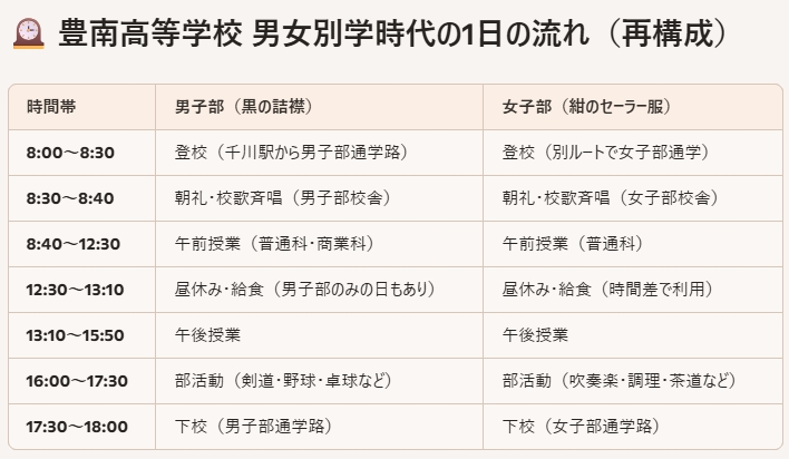 東京都豊島区にある豊南高等学校は、男子部・女子部の別学制(平成16年度より共学)をとり、それぞれの特性を引き出し、伸ばすことを心がけています。もちろん、普段の学校生活のほか、対面式・終業式・始業式・体育祭・修学旅行・卒業式などのほとんどの学校行事も男女別に行われていましたが、入学式・文化祭(銀杏祭)・登校時間・図書館・昼休みの食堂での給食は男子部・女子部合同でした。豊南高校の校歌(男子部・女子部共通)は、入学式・始業式・終業式・卒業式でよく歌われますが、全て男女別で行われ、男子部・女子部が一緒に歌うことはありませんでした。校章は、銀杏の葉3枚を象ったものであり、「知育」「徳育」「体育」を表しております。校舎の周りにもたくさんの銀杏が校樹として植えられています。また、授業編成は、従来の50分授業を、2001年度から1時間目は90分授業に改定(試験当日は通常通り、50分授業)。それから、かつては定時制(男女共学、生徒のほとんどは自衛官・看護婦。手紙調べ。伝説の俳優・松田優作(1949〜1989)も在籍していました)もありました。なお、併設中学校(男女別学)は1947〜1957年まで高校と同じ敷地内に存在していましたが、生徒の減少により休校、1984年に正式に廃止されました。ちなみに、豊南高校を初めて知ったのは2000年10月、本サイトの姉妹サイトでもある「詰襟学生服の男子校・男女別学の高校リスト」の掲示板からでした(一部、電話とメール調べ)。