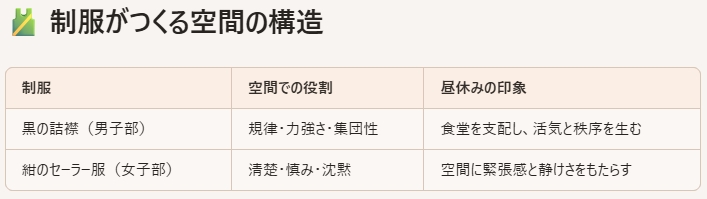 | 昼食 | 食堂あり。ほとんどは男子部ばかりだが、女子部の生徒が食堂で給食を食べるとき、テーブル全16個のうち、入り口付近に女子部専用テーブルを2個用意。また、行事などのズレにより、男子部のみになる場合あり。詳しくは、食堂のコーナーにて。 小規模(96席)のため、利用できない場合はお弁当の持参も可能 |